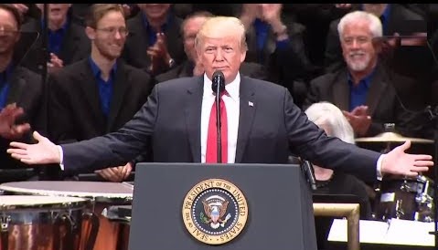 Các phương tiện truyền thông không trung thực đó sẽ không bao giờ ngăn cản được chúng tôi hoàn thành mục tiêu của mình. Nhân danh nhân dân Hoa Kỳ vĩ đại của chúng ta, chúng tôi sẽ không bao giờ đề điều đó xảy ra. Mục tiêu và kế hoạch của họ sẽ không phải là mục tiêu của các bạn. Các bạn đã từng nói điều đó. Tôi sẽ không bao giờ ngừng chiến đấu vì các bạn. Tôi đang làm việc về thương mại, về kinh tế, về Tòa án Tối cao, về Tu chính án Hai và về quân đội của chúng ta. Đối với vấn đề cựu chiến binh và biên giới, chúng tôi đang làm được những việc chưa từng có.