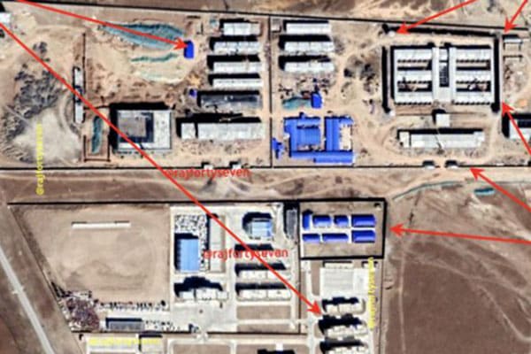 Bức ảnh trên cho thấy một trại tập trung đúng nghĩa, với các bức tường an ninh bao quanh một số kiến trúc. 5 tòa nhà nằm song song nhau có thể là nơi giam giữ, một số tòa nhà khác dùng làm nơi tẩy não. Xung quanh 5 tòa nhà giam giữ có các tháp canh.