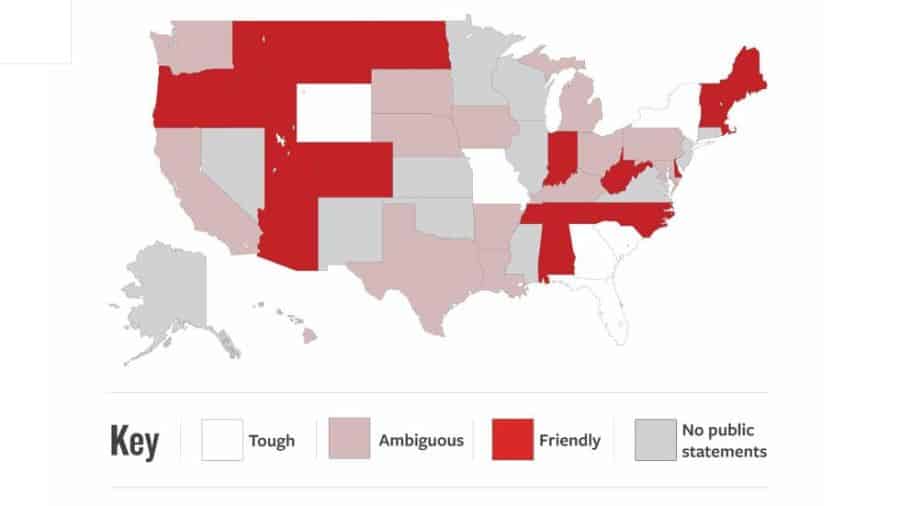 Các tiểu bang có 17 thống đốc có thái độ thân thiện đối với Trung Quốc (ĐCSTQ) lần lượt là các tiểu bang Alabama, Arizona, Colorado, Delaware, Idaho, Indiana, Maine và Massachusetts., Montana, New Hampshire, Bắc Carolina, Bắc Dakota, Oregon, Tennessee, Utah, Vermont và Tây Virginia.