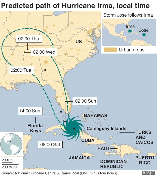 BBC cho hay bão Jose di chuyển ngay phía sau bão Irma vẫn đang duy trì mạnh cấp 4 với sức gió 233km/giờ.