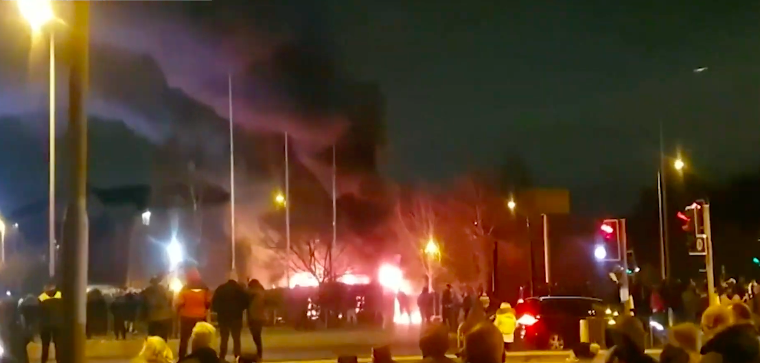 Biểu tình nhanh chóng biến thành bạo loạn: những người tham gia ném pháo sáng, chai thủy tinh, gạch, nón giao thông, thậm chí đốt một xe của lực lượng cảnh sát (Garda Síochána) và bắn tia laser vào trực thăng cảnh sát. Cảnh sát đã được triển khai, chó nghiệp vụ, vòi rồng và các biện pháp trấn áp khác.