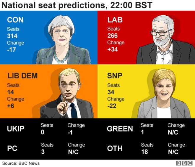 Exit poll dự báo rằng đảng Bảo thủ sẽ có 314 ghế (chiếm 48,3%), đảng Lao động chiếm 266 ghế (chiếm 40,9%), một tỉ lệ rất sít sao, có nghĩa rằng không có đảng chiến thắng rõ ràng và có thể sẽ dẫn tới “Quốc hội treo”. Nếu điều này là chính xác đó sẽ là một kết quả sốc, có thể khiến chính trị nội địa nước Anh rơi vào tình trạng hỗn loạn và trì hoãn các cuộc đàm phán rời Liên minh châu Âu (Brexit).
