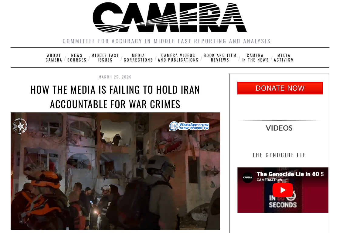 Tổ chức giám sát truyền thông ở Mỹ — Tổ chức giám sát truyền thông ở Mỹ — Ủy ban Giám sát Độ Chính xác trong Thông tin và Phân tích về Trung Đông (Committee for Accuracy in Middle East Reporting and Analysis-CAMERA) (Ảnh: Trích xuất hình ảnh màn hình)