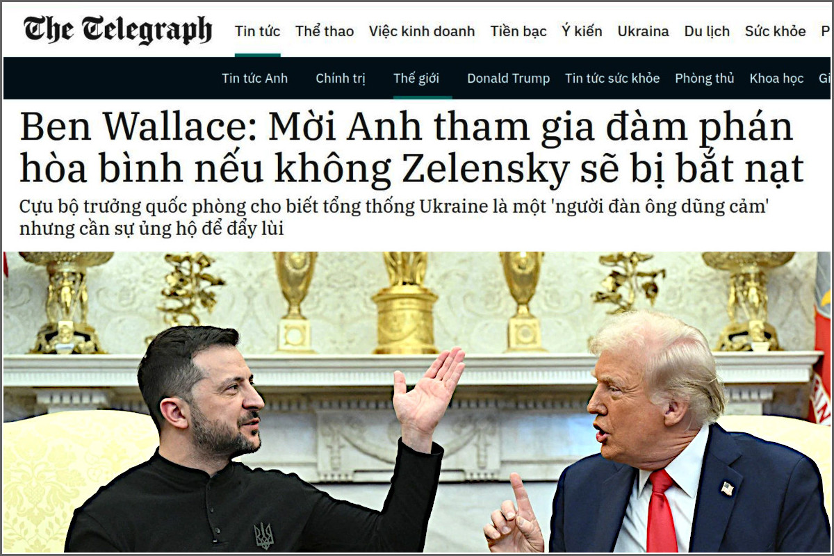 Như có thể thấy trong bài của Telegraph (Anh) đăng hôm Thứ Năm, tiêu đề “Ben Wallace: Hãy mời Anh tham gia đàm phán hòa bình, nếu không Zelensky sẽ bị bắt nạt” và lời nhận định rằng “tuy tổng thống Ukraine là một người đàn ông dũng cảm, thế nhưng mà, ông vẫn cần ủng hộ của Anh để đẩy lùi sức ép.”