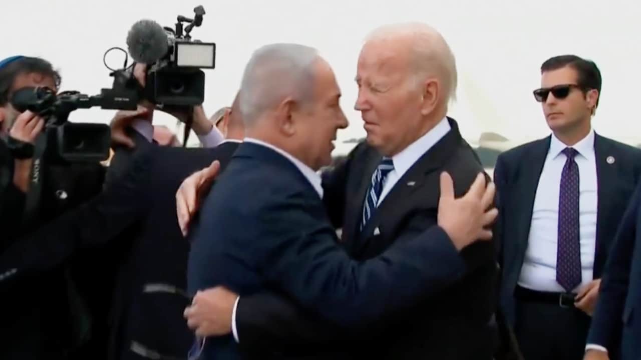 Ông Biden và Netanyahu ôm nhau thắm thiết tại sân bay, thể hiện tình hữu nghị nhiều năm của hai nhân vật đứng đầu quốc gia. (Ảnh chụp màn hình video)