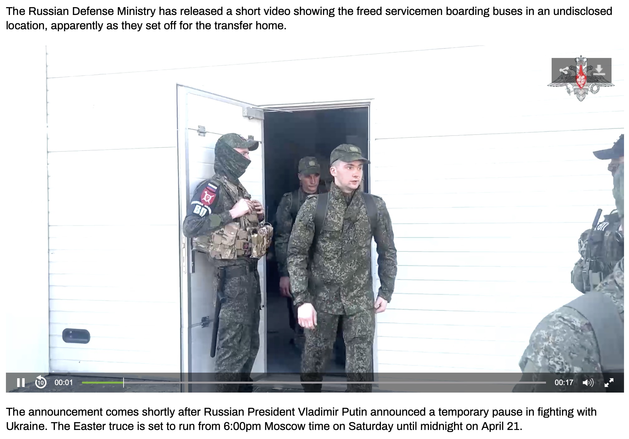 Bộ Quốc phòng Nga đã công bố một đoạn video ngắn cho thấy cảnh những quân nhân được trả tự do lên xe buýt tại một địa điểm không được tiết lộ, dường như là khi họ lên đường để trở về nhà.