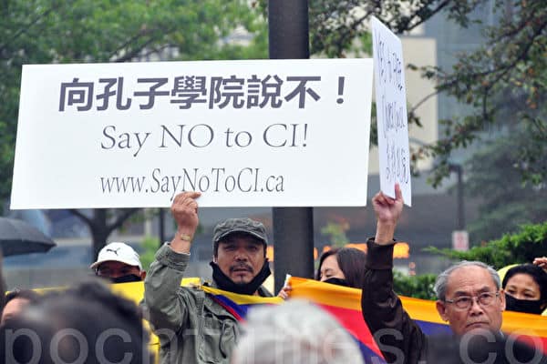 Thỉnh nguyện bên ngoài tòa nhà văn phòng của Cục Giáo dục Toronto (TDSB) ngày 11/6/2014, nhằm phản đối việc đưa Viện Khổng Tử vào Toronto. (Ảnh: Chu Hành / Epoch Times)