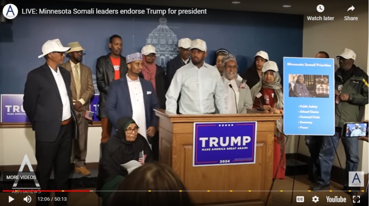 Vào hôm thứ Bảy (2/11), một nhóm các nhà lãnh đạo người gốc Somali tại tiểu bang Minnesota đã công khai ủng hộ ông Donald Trump, đề cử viên năm 2024 của Đảng Cộng Hòa, cho vị trí tổng thống thứ 47 của Hợp Chủng Quốc Hoa Kỳ.