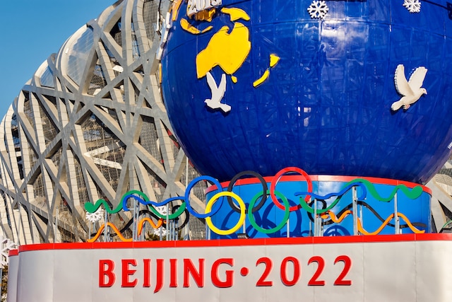 Biểu tượng Olympic Bắc Kinh 2022 đặt tại Sân vận động Tổ chim Bắc Kinh. (Ảnh: Mirko Kuzmanovic / Shutterstock).