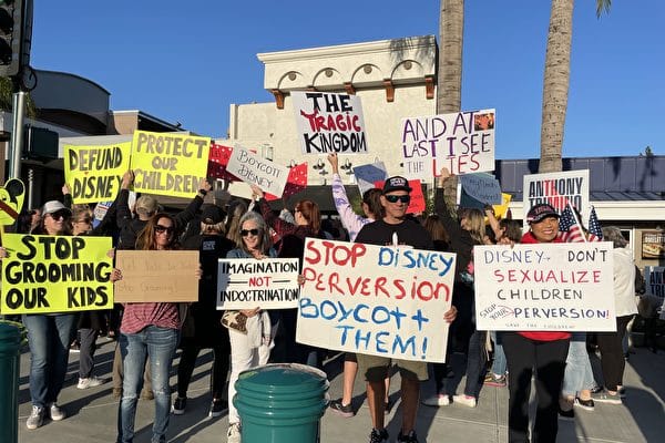 Ngày 12/4/2022, người dân tổ chức buổi mít tinh “Tẩy chay Disney, Bảo vệ trẻ nhỏ của chúng ta" ở gần các công viên giải trí Disney tại Quận Cam, tiểu bang California. (Ảnh: Li Mei / Epoch Times).