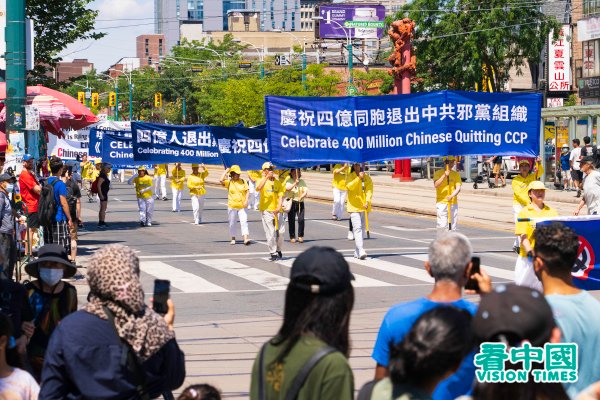 Ngày 6/8, học viên Pháp Luân Công ở Toronto, Canada đã tổ chức đại lễ diễu hành tại trung tâm thành phố, nhằm ủng hộ và kỷ niệm 400 triệu người dân Trung Quốc đã nhận ra bản chất của ĐCSTQ và lựa chọn tam thoái.