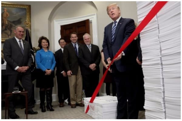 Ngay sau khi nhậm chức vào năm 2017, Tổng thống Trump đã ký một sắc lệnh hành pháp, chỉ đạo các cơ quan liên bang phải loại bỏ 2 quy định cũ nếu muốn đưa ra một qui định mới. Ngoài ra, pháp lệnh chỉ thị cho các cơ quan chính phủ phải bù lại những chi phí mà mỗi qui định mới tạo ra từ khoản tiết kiệm nhờ việc cắt giảm các quy định cũ.