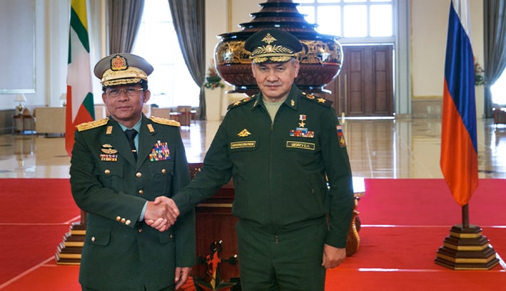 Bộ trưởng Quốc phòng Nga Sergei Shoigu và Tổng tư lệnh Các lực lượng vũ trang Myanmar, Thượng tướng Min Aung Hlaing (Nguồn: Bộ Quốc phòng Liên bang Nga/Thư viện ảnh)
