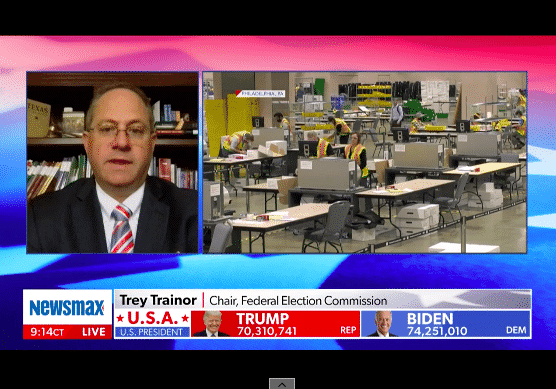 Trong lần xuất hiện hôm 6/11 trên chương trình “Báo cáo Quốc gia” của Newsmax TV, ông Trey Trainor – Chủ tịch Ủy ban Bầu cử Liên bang cho biết các địa điểm không cấp quyền cho quan sát viên để giám sát quá trình kiểm phiếu có thể liên quan đến gian lận bầu cử.
