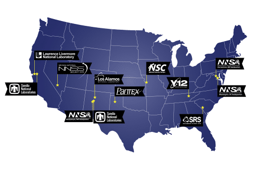 NNSA là cơ quan chịu trách nhiệm quản lý vũ khí hạt nhân của quốc gia, và mặc dù ít được chú ý nhất, nhưng nó lại chiếm phần lớn ngân sách của DOE. Tương tự, Phòng thí nghiệm Quốc gia Sandia và Los Alamos là nơi tiến hành các nghiên cứu về nguyên tử liên quan đến cả năng lượng hạt nhân dân dụng và vũ khí hạt nhân. Văn phòng Vận tải An toàn được giao nhiệm vụ chuyển uranium đã được làm giàu và các vật liệu khác quan trọng để duy trì kho dự trữ hạt nhân.