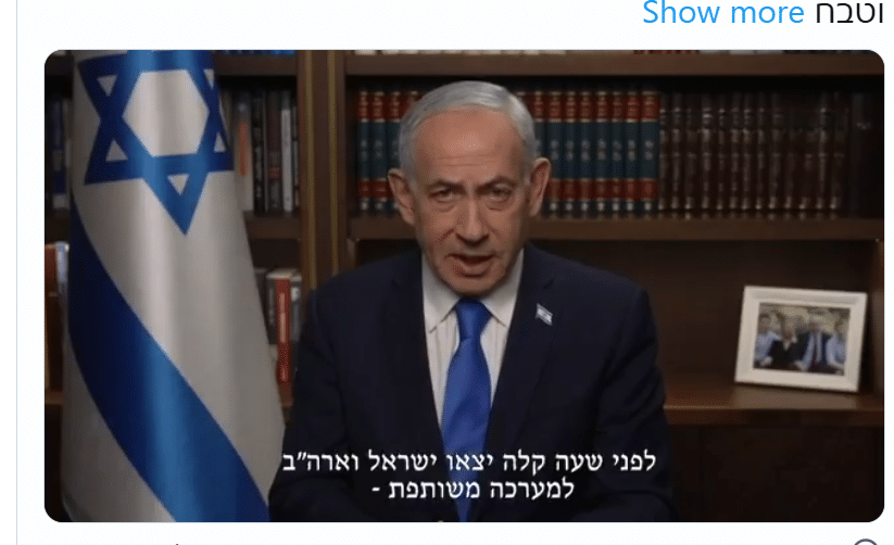 Thủ tướng Benjamin Netanyahu đã gửi một thông điệp video bằng tiếng Do Thái sau khi Israel và Mỹ phát động một loạt các cuộc tấn công nhằm vào Iran, nói rằng chiến dịch này được tiến hành “để loại bỏ mối đe dọa hiện hữu” do Cộng hòa Hồi giáo gây ra, và “tạo điều kiện” cho người dân Iran thay đổi vận mệnh của họ.