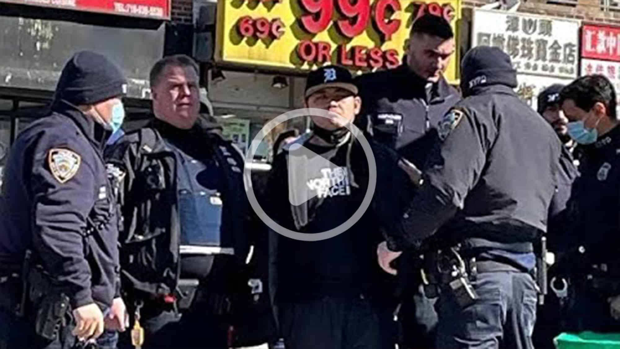 Khoảng 11h55 trưa, cảnh sát Chi cục 109 đã bắt giữ thành công kẻ côn đồ này tại ngã 3 phố Main và đại lộ Kissena. Theo đoạn video được quay bởi các tình nguyện viên tại điểm chân tướng, ít nhất 6 cảnh sát đã khuất phục, còng tay và lục soát người anh ta để tìm hung khí, sau đó áp giải người này lên xe cảnh sát, đưa về đồn.