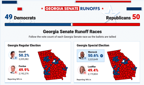 Cụ thể, theo Decision Desk HQ, ông Ossoff đang hơn ứng viên đảng Cộng Hòa David Perdue hơn 9.500 phiếu; trong khi đó ông Warnock hơn bà Kelly Loeffler hơn 46.500 phiếu.
