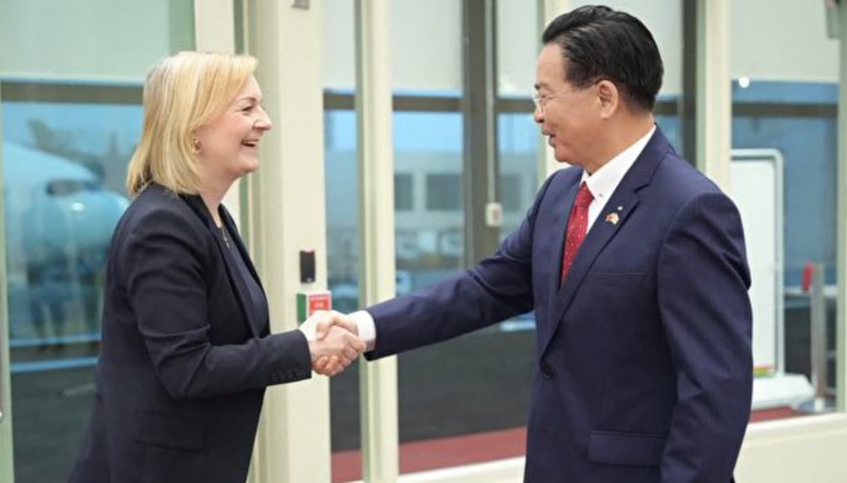 Ngày 16/5/2023, cựu Thủ tướng Anh Liz Truss (trái) được Ngoại trưởng Đài Loan Ngô Chiêu Nhiếp (Joseph Wu) chào đón tại sân bay quốc tế Đào Viên. (Ảnh: Bộ Ngoại giao Đài Loan)