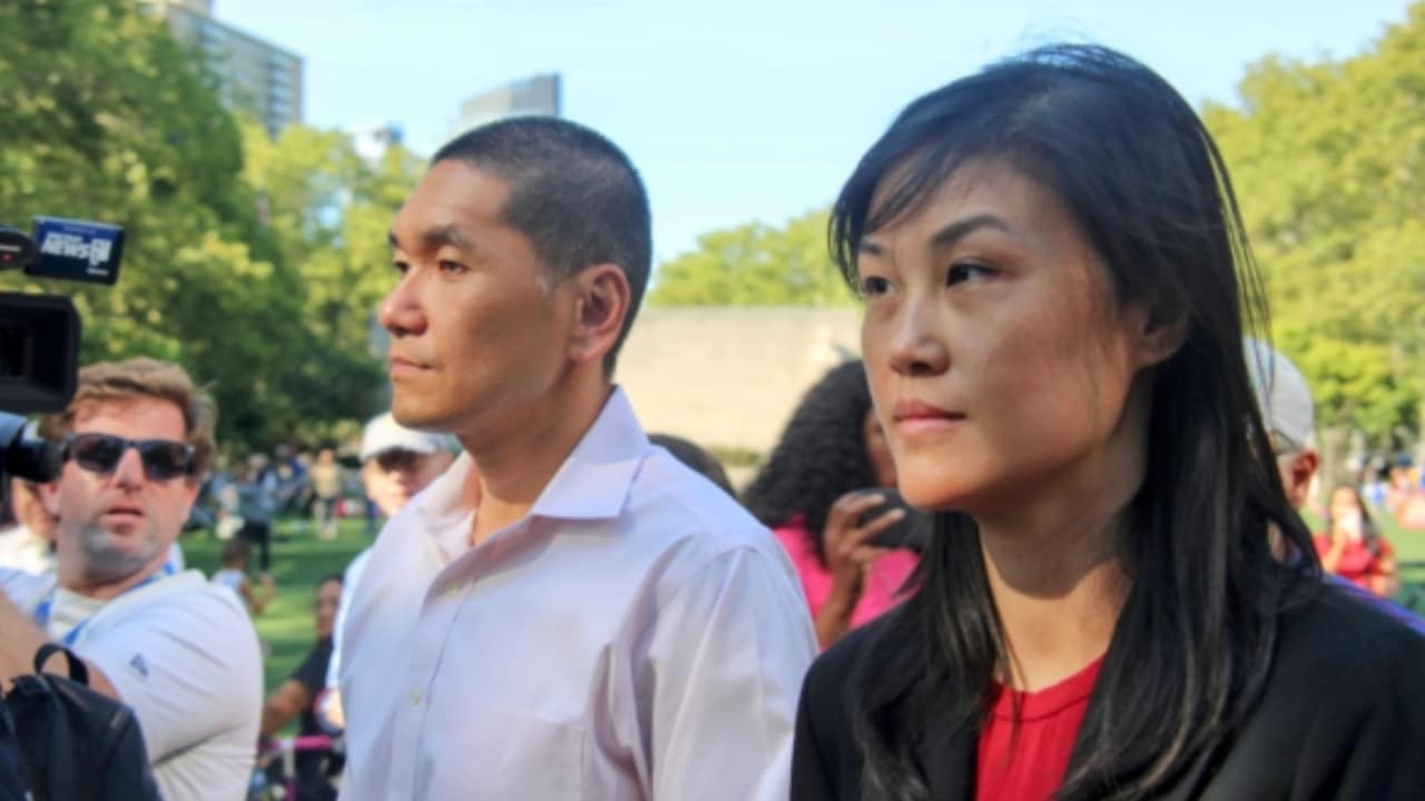 Sáng thứ Ba (3/9), bà Tôn Văn (Linda Sun, bên phải) - cựu Phó chánh văn phòng bang New York Kathy Hochul, kiêm nguyên Phó giám đốc Bộ Lao động bang, và chồng bà là ông Hồ Kiêu (Chris Hu, bên trái) đã bị FBI bắt giữ tại biệt thự ở Long Island. Bà Tôn Văn bị cáo buộc làm điệp viên bí mật cho Chính phủ Trung Quốc. Trong ảnh là 2 vợ chồng bà xuất hiện bên ngoài tòa án. (Ảnh: Hoàng Tiểu Đường/ Epoch Times)