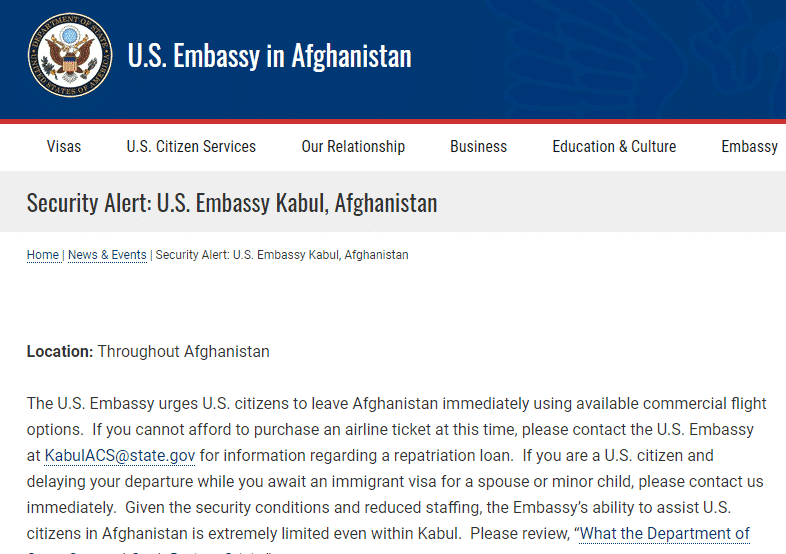 Cảnh báo của Đại sứ quán Mỹ tại Kabul nêu rõ: “Đại sứ quán Mỹ thúc giục công dân Mỹ phải rời khỏi Afghanistan ngay lập tức, sử dụng các lựa chọn chuyến bay thương mại sẵn có. Do các điều kiện an ninh và nhân viên đã bị cắt giảm, khả năng hỗ trợ công dân Mỹ tại Afghanistan của Đại sứ quán Mỹ là cực kỳ giới hạn, thậm chí ngay ở Kabul”.