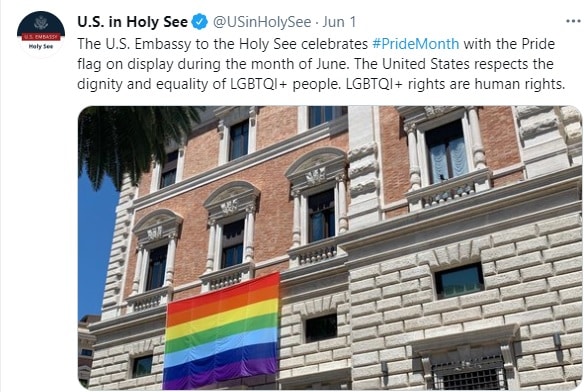 Đại sứ quán Mỹ tại Tòa thánh Vatican loan báo rằng họ đang treo lá cờ cầu vồng – biểu tượng của người đồng tính và sẽ treo lá cờ này trong cả tháng Sáu để bày tỏ sự ủng hộ đối với cộng đồng người đồng tính.