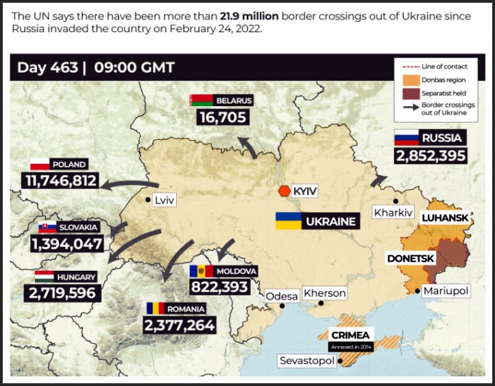Trong báo cáo của Liên Hợp Quốc vào đầu tháng này, con số người di cư khỏi Ukraine kể từ đầu chiến tranh 2/2022 lên tới tận 22 triệu người (xem hình trên). Cao hơn đáng kể so với các con số của các viện đã dẫn Ukraine.