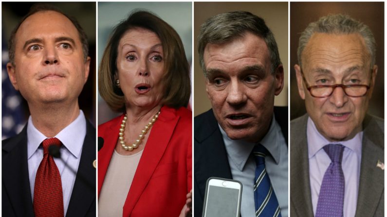 Bốn nhà lập pháp Dân chủ (từ trái qua phải gồm) Dân biểu Adam Schiff, Dân biểu Nancy Pelosi, Thượng nghị sĩ Mark Warner và Thượng nghị sĩ Chuck Schumer. (Ảnh: The Epoch Times)