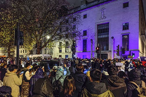 Tối 27/11 đông đảo sinh viên Trung Quốc tại Anh đến đối diện đại sứ quán ĐCSTQ ở London để phản đối ‘Zero COVID’ hà khắc. (Ảnh: Steven Leung)