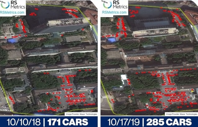 Hình ảnh chụp vệ tinh cho thấy các bãi đỗ xe ở bệnh viện tại Vũ Hán tăng mạnh vào tháng 8 năm 2019.