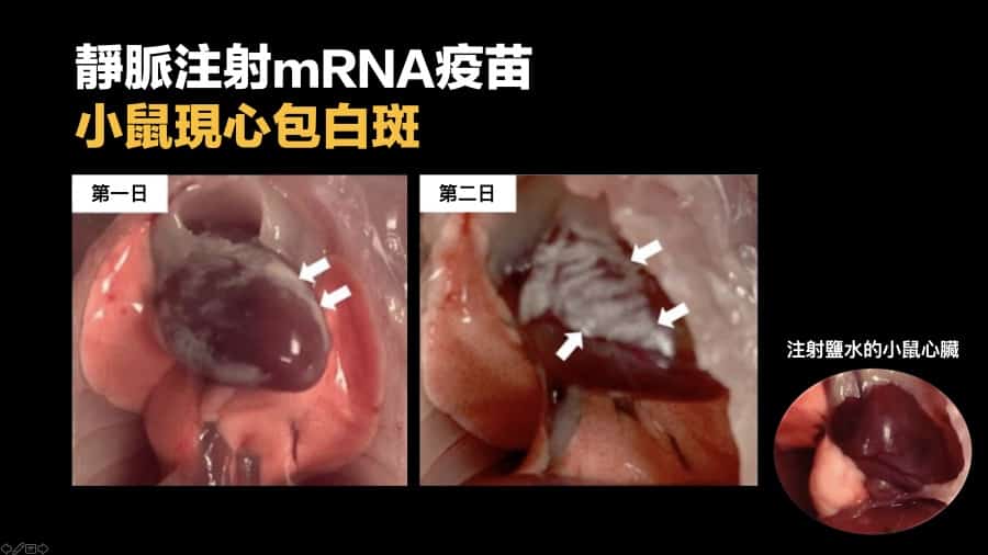 Nghiên cứu cho thấy ở những con chuột được tiêm vắc-xin vào tĩnh mạch, trong vòng 24 đến 48 giờ, xuất hiện rõ rệt những dấu hiệu viêm cơ tim và viêm màng ngoài tim. Bao gồm hiện tượng thâm nhiễm tế bào viêm, tế bào chết và thậm chí là vôi hóa màng ngoài tim. Hình ảnh giải phẫu cho thấy lớp màng ngoài tim của chuột có những đốm trắng rất rõ.