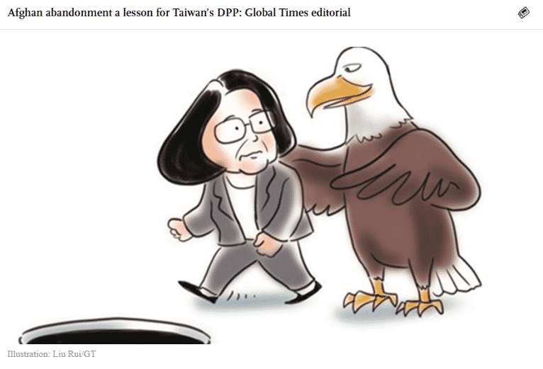 Sau đó, Hoàn cầu Thời báo đề cập đến Đài Loan: “Cách Washington bở rơi chế độ Kabul đặc biệt gây sốc cho một số bên tại châu Á, trong đó có đảo Đài Loan. Đài Loan là vùng lãnh thổ phụ thuộc nhất vào sự bảo vệ của Mỹ tại châu Á, và những quan chức trong Đảng Dân tiến của hòn đảo này đã đang đưa Đài Loan ngày càng lún sâu vào con đường không bình thường này. Tình hình tại Afghanistan đã thay đổi cơ bản sau khi nước này bị Mỹ bỏ rơi. Và Washington đã rời đi bất chấp tình hình ngày càng tồi tệ ở Kabul. Đây chẳng phải là điềm xấu cho số phận tương lai của Đài Loan hay sao?”