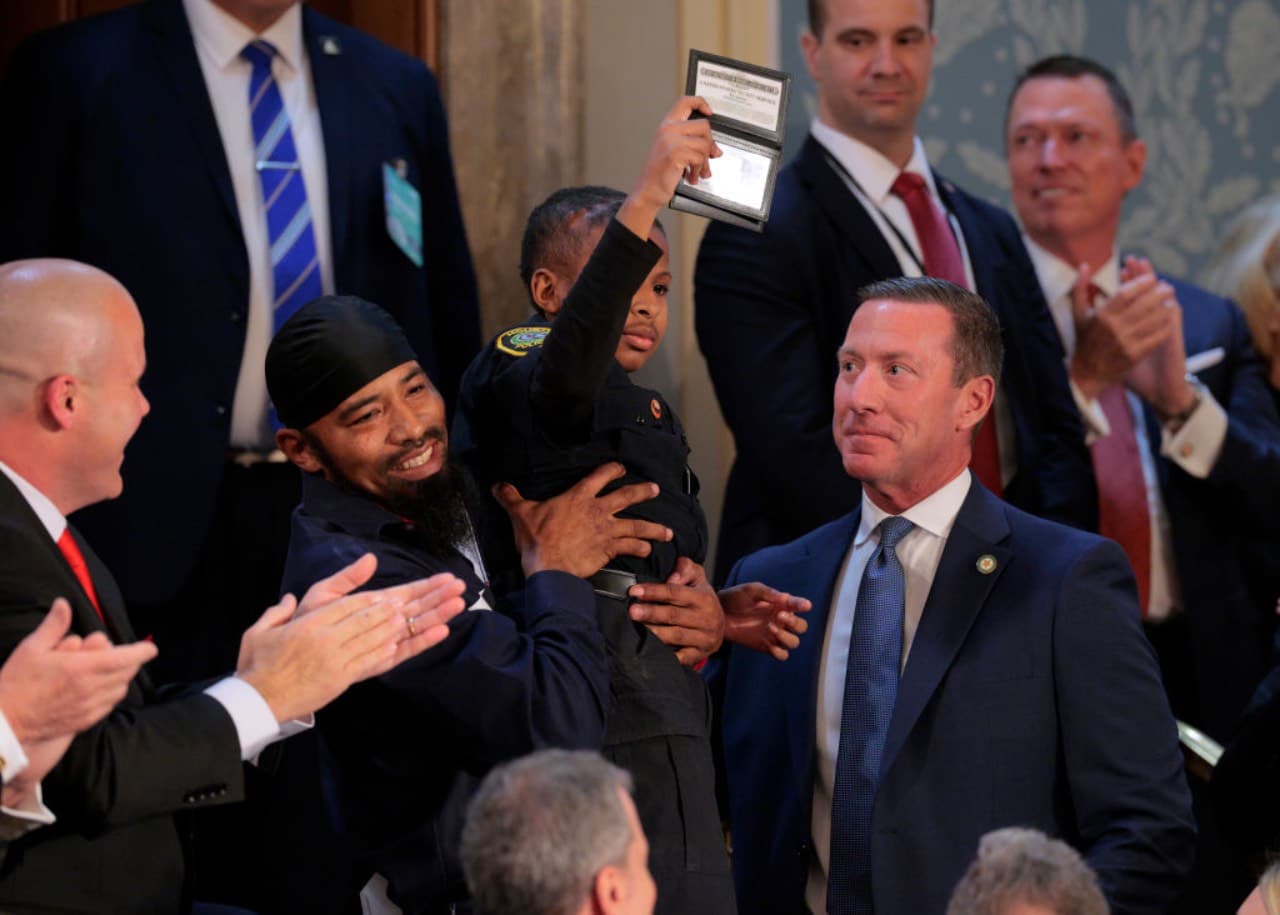 Cậu bé 13 tuổi sống sót sau căn bệnh ung thư Devarjaye "DJ" Daniel được Giám đốc Mật vụ Sean Curran (phải) trao huy hiệu danh sự của Sở Mật vụ tại sự kiện Tổng thống Hoa Kỳ Donald Trump phát biểu trong phiên họp chung của Quốc hội tại Điện Capitol Hoa Kỳ vào ngày 04 tháng 3 năm 2025. (Ảnh: Chip Somodevilla/Getty Images)
