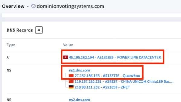 Theo kết quả phân tích được cư dân mạng đăng tải, bản ghi NS (bản ghi máy phục vụ tên miền) của tên miền dominionvotingSYSTEMS.com hiển thị một trung tâm dữ liệu ở Tuyền Châu – Trung Quốc. Bản ghi máy chủ tên miền là thông tin cho biết máy chủ nào truyền tải thông tin hệ thống tên miền cho một trang mạng, kết quả truy vấn có nghĩa là tên miền của dominionvotingSYSTEMS.com liên quan đến một trung tâm dữ liệu ở Tuyền Châu và nhà cung cấp dịch vụ Internet của trung tâm dữ liệu này là China Telecom.