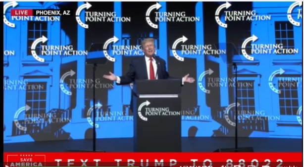 Trong bài phát biểu gần hai giờ tại sự kiện ‘Turning Point Action’ diễn ra tại Phoenix, tiểu bang Arizona vào tối thứ Bảy (24/7, giờ Mỹ), cựu Tổng thống Donald Trump đã nói với những người ủng hộ rằng Đảng Dân chủ không thể “chiến thắng các cuộc bầu cử nếu không gian lận; không cách nào chiến thắng”. Ông khẳng định các cuộc thanh tra bầu cử 2020 đang bơi bày “tội phạm thế kỷ”.
