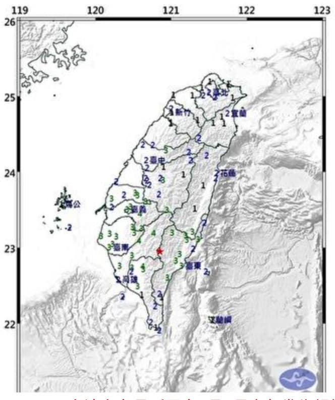 Nơi cảm nhận được rung chấn mạnh nhất thuộc một số khu vực ở thành phố Cao Hùng, huyện Bính Đông, huyện Gia Nghĩa, cấp độ mạnh nhất là cấp 4; một số khu vực thành phố Đài Nam, huyện Nam Đầu đo được rung động 3 độ Richter; thành phố Đài Bắc đo được rung chấn 2 độ Richter. Ngoài ra, toàn bộ Đài Bắc có rung chấn nhỏ nhất là 1 độ Richter.