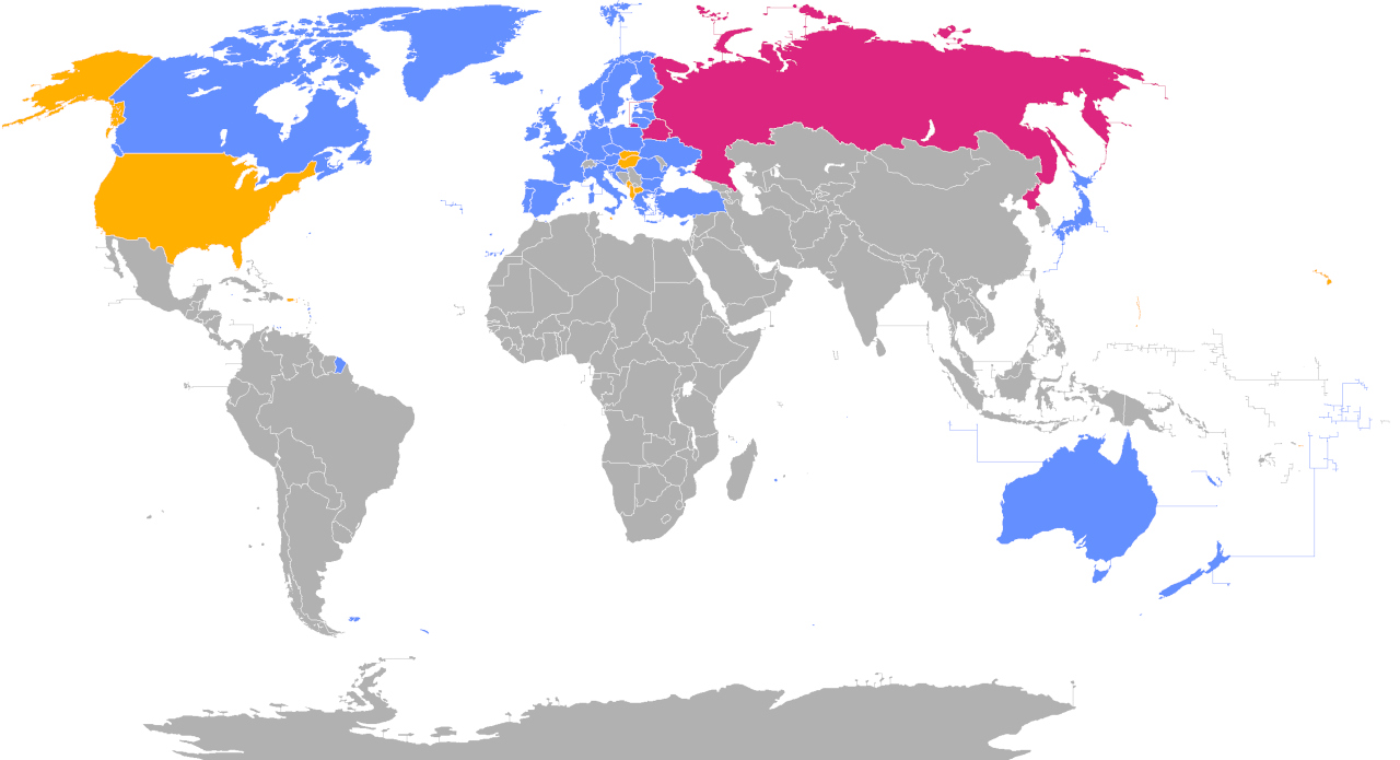 Bản đồ trên là theo ngày 10/7/2025, với 31 quốc gia thành viên (màu xanh). Phần màu vàng là quốc gia tuy thuộc EU/NATO nhưng không tham gia liên minh này. Phần màu đỏ là Liên bang Nga (nguồn: Wikipedia)