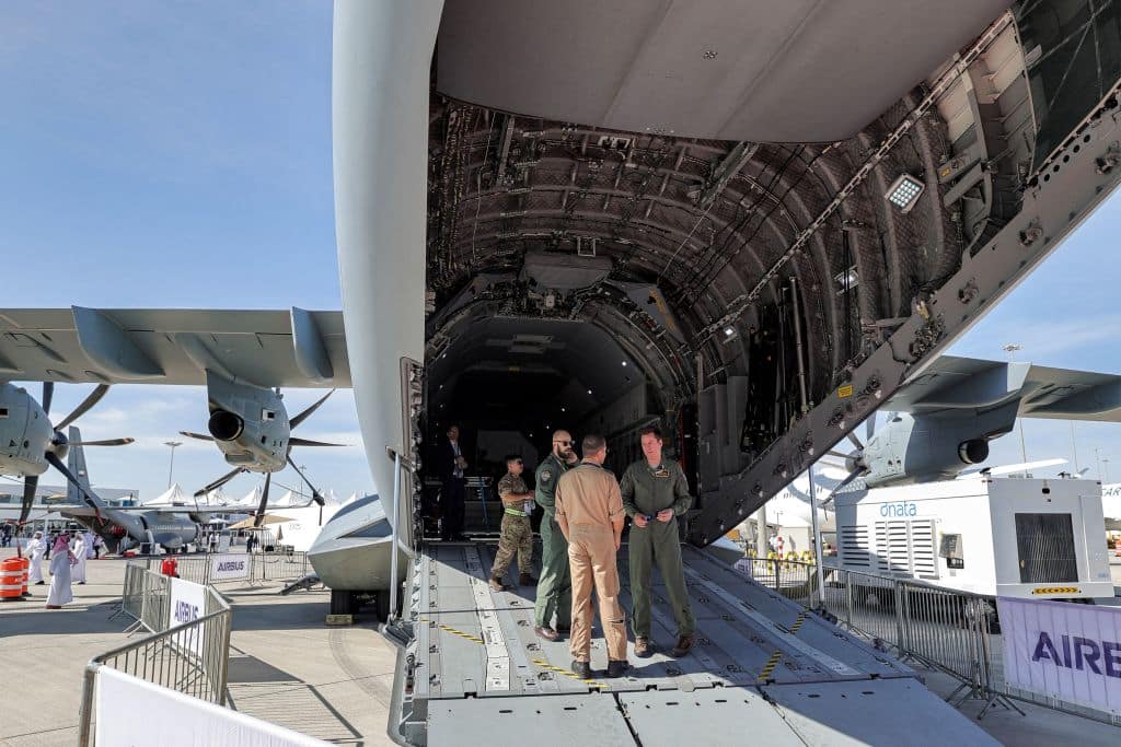 Các sĩ quan Đức đúng ở lối vào phía sau chiếc máy bay vận tại Airbus A400M thuộc biên chế Không lực Đức trong một sự kiện chào hàng tại Dubai, UAE vào ngày 13 tháng 11 năm 2023. (Nguồn ảnh: GIUSEPPE CACACE/AFP via Getty Images)