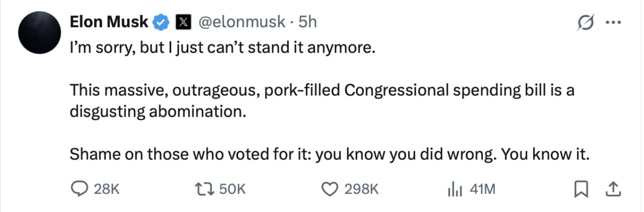 “Tôi xin lỗi, nhưng tôi không thể chịu đựng thêm được nữa. Dự luật chi tiêu của Quốc hội khổng lồ, vô lý và ưu ái địa hạt để kiếm phiếu này là đáng kinh tởm. Thật xấu hổ cho những ai đã bỏ phiếu cho dự luật này: các người biết mình đã làm sai. Các người biết điều đó“, ông Musk viết.