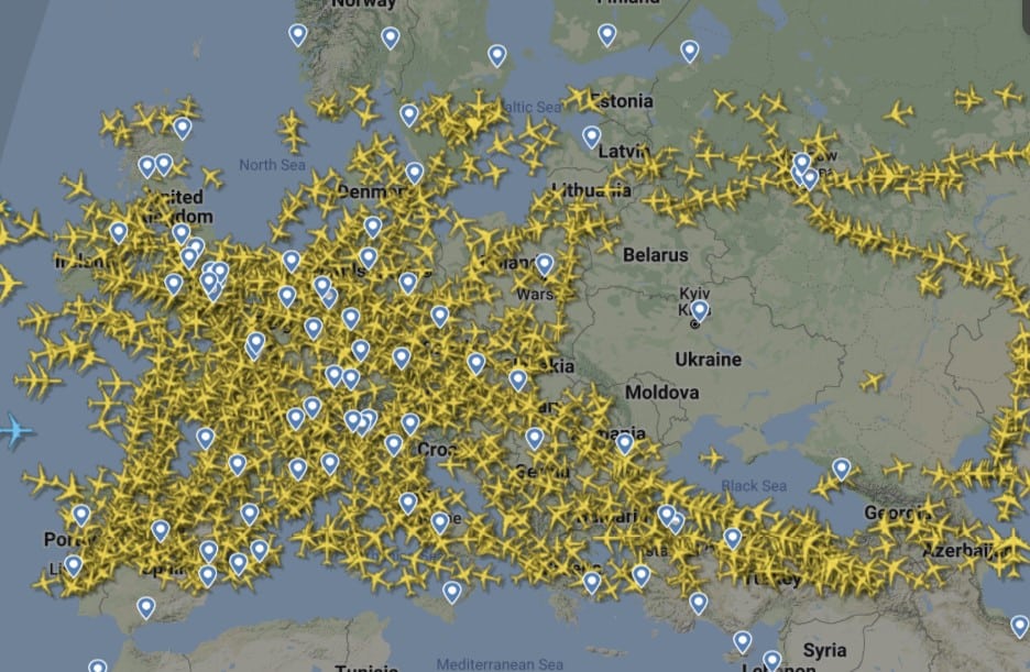 Một bản đồ từ trang web theo dõi chuyến bay Flightradar24 cho thấy, không có chuyến bay nào qua Ukraine và chỉ có vài chuyến bay qua Belarus, nằm ở phía Bắc Ukraine hoặc Moldova, nằm ở phía Nam Ukraine.