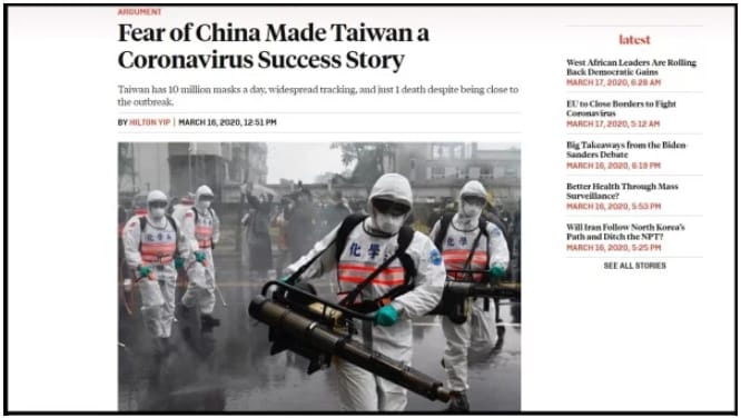 Theo Hãng Thông tấn Trung ương Đài Loan (CNA), bài viết có tựa đề “Lo ngại Trung Quốc đã tạo nên câu chuyện thành công của Đài Loan trong chống virus corona” (Fear of China Made Taiwan a Coronavirus Success Story) mà Tạp chí “Chính sách Đối ngoại” (Foreign Policy) của Mỹ công bố đã chỉ ra, dịch bệnh viêm phổi Vũ Hán hiện đã lan rộng đến hơn một nửa thế giới với hơn 160.000 người bị nhiễm, nhưng có hiện tượng đáng chú ý là một nước chỉ cách Trung Quốc 176 cây số lại giữ được tuyến phòng thủ virus.