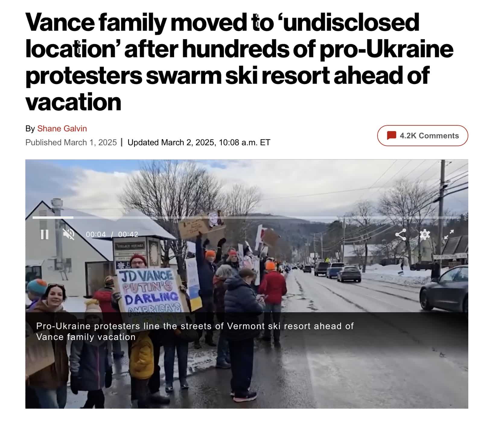 Phó Tổng thống JD Vance buộc phải chuyển gia đình đến một “nơi bí mật” sau khi hàng trăm người biểu tình ủng hộ Ukraine tràn vào khu nghỉ dưỡng trượt tuyết Vermont mà gia đình ông đang đi nghỉ vào thứ Bảy (⅓). Sự việc này xảy ra một ngày sau cuộc tranh cãi công khai của ông với Tổng thống Ukraine Volodymyr Zelensky tại Nhà Trắng vào thứ Sáu (28/2).