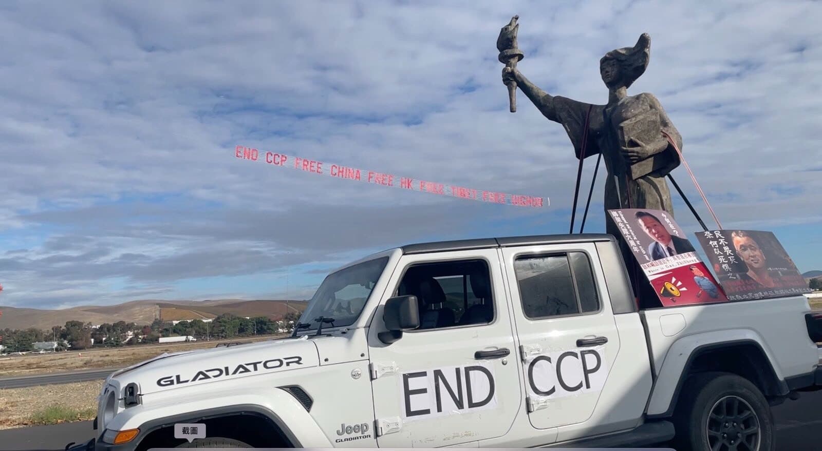 Biểu ngữ có nội dung bằng tiếng Anh: “HÃY KẾT THÚC TRUNG CỘNG, TỰ DO CHO TRUNG QUỐC, TỰ DO CHO HỒNG KÔNG, TỰ DO CHO TÂY TẠNG, TỰ DO CHO DUY NGÔ NHĨ” (END CCP FREE CHINA FREE HK FREE TIBET FREE UIGHUR).