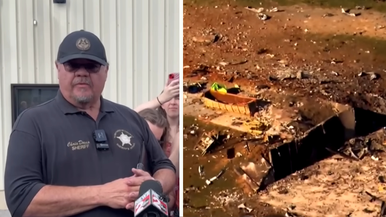 Cảnh sát trưởng hạt Humphreys, ông Chris Davis thông báo tình hình điều tra vụ nổ nhà máy ở bang Tennessee trong buổi họp báo hôm thứ Bảy (11/10) - (Ảnh ghép chụp màn hình video)