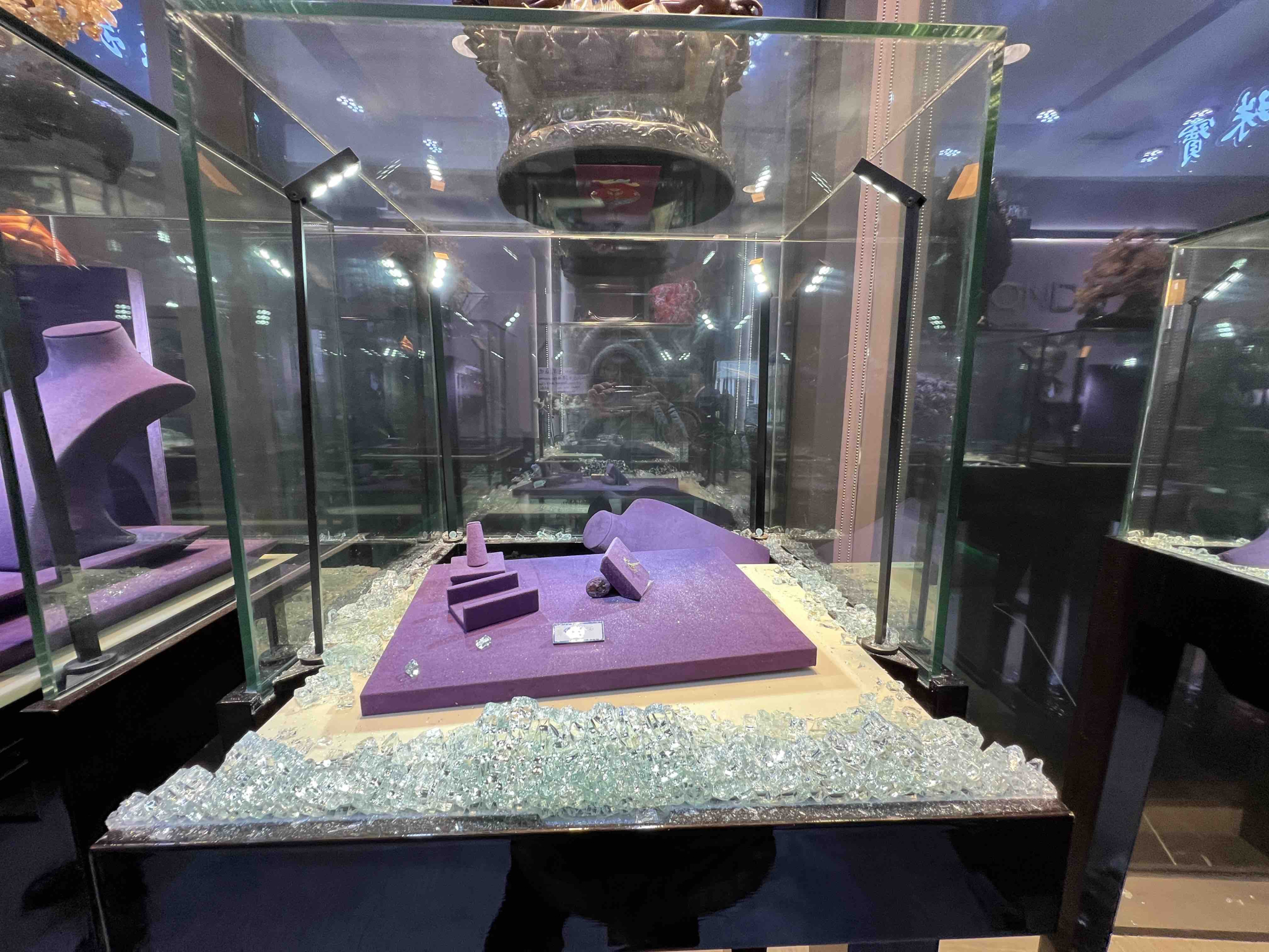 Sau đó ít nhất 3 chiếc ô tô khác kéo đến, khoảng 15 người đàn ông bịt mặt cầm búa nhỏ và túi xách nhanh chóng xông vào tiệm, đập phá quầy tủ, tủ kính và cướp đi đồ bên trong.