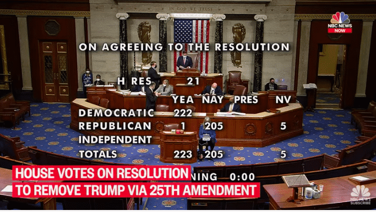 Cuộc bỏ phiếu với tỷ lệ 223 phiếu ủng hộ nghị quyết và 205 phiếu phản đối, đã diễn ra chỉ vài giờ sau khi Phó Tổng thống Pence đã chuyển lá thư tới Chủ tịch Hạ viện Nancy Pelosi tuyên bố rằng ông sẽ không thực hiện hành động theo yêu cầu của bà và Đảng Dân chủ.