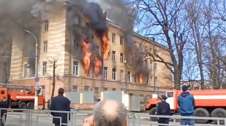 Video về hỏa hoạn lan truyền trên mạng xã hội Nga cho thấy, khói dày đặc và ngọn lửa cuồn cuộn từ các cửa sổ của tòa nhà viện nghiên cứu này.