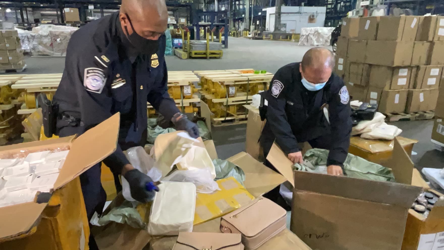 Tại khu vực kho hàng của sân bay, các quan chức của CBP và HSI đã trưng bày một loạt các sản phẩm nhái của giày Nike, áo khoác Burberry, áo thi đấu NBA, điện thoại iPhone, tai nghe iPhone, nước hoa Chanel, đồng hồ Rolex, Đồng hồ cao cấp Thụy Sĩ Audemars Piguet, túi Michael Kors, túi Coach, túi Christian Dior, túi Gucci, thắt lưng Versace, mắt kính Cartier, mỹ phẩm hàng hiệu…
