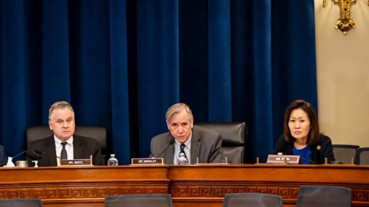 Ngày 20/3/2024, từ trái sang là Dân biểu Chris Smith, Chủ tịch Ủy ban Điều hành Quốc hội Hoa Kỳ về Trung Quốc (CECC), Thượng nghị sĩ Jeff Merkley và Dân biểu Michelle Steel tại phiên điều trần về thu hoạch nội tạng. (Ảnh: Madalina Vasiliu/Epoch Times)