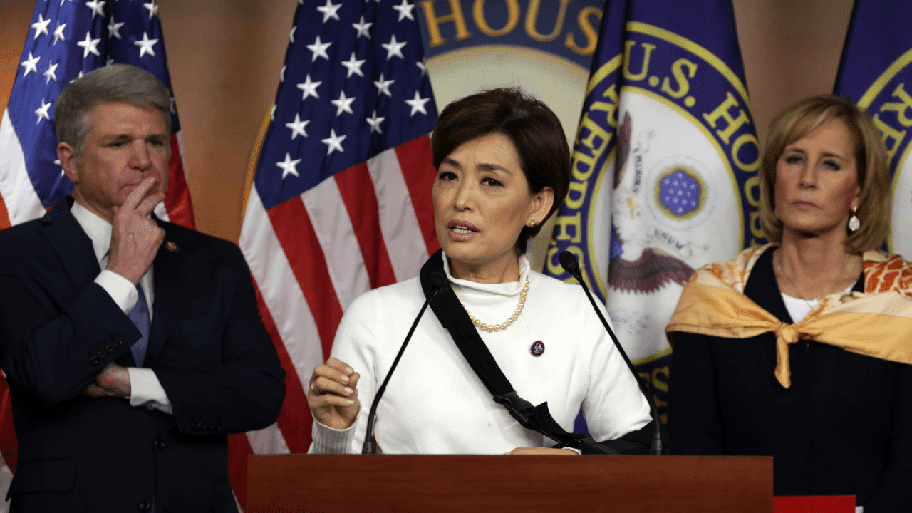 Dân biểu Hoa Kỳ Young Kim ( Đảng Cộng hoà, California) (ở giữa); Dân biểu Michael McCaul (Đảng Cộng hoà, Texas) (bên trái) và Dân biểu Claudia Tenney (Đảng Cộng hoà, New York) (bên phải), trong cuộc họp báo tại Tòa nhà Quốc hội Hoa Kỳ .(Ảnh: Alex Wong/Getty Images)